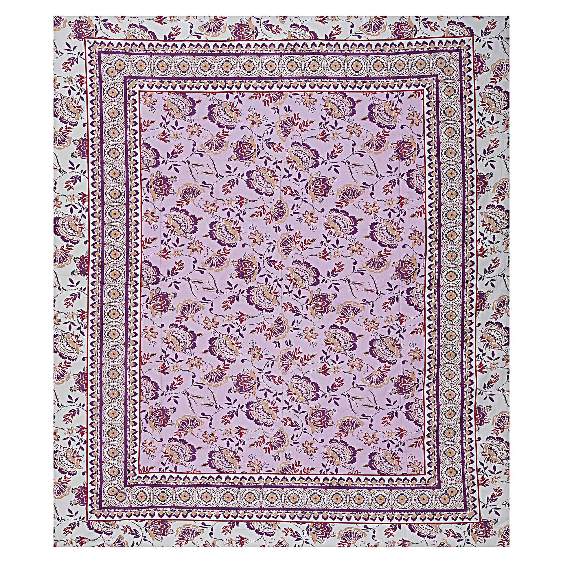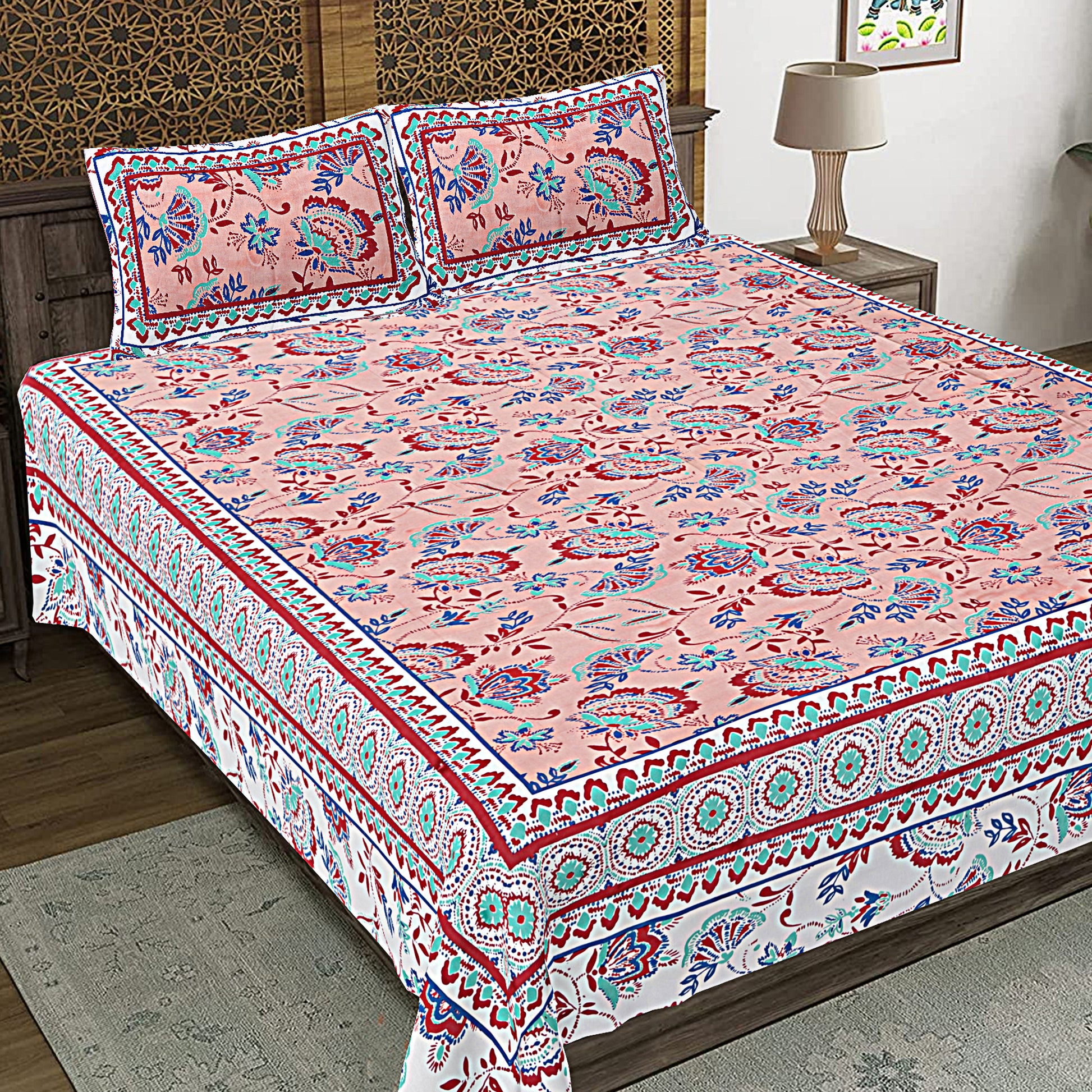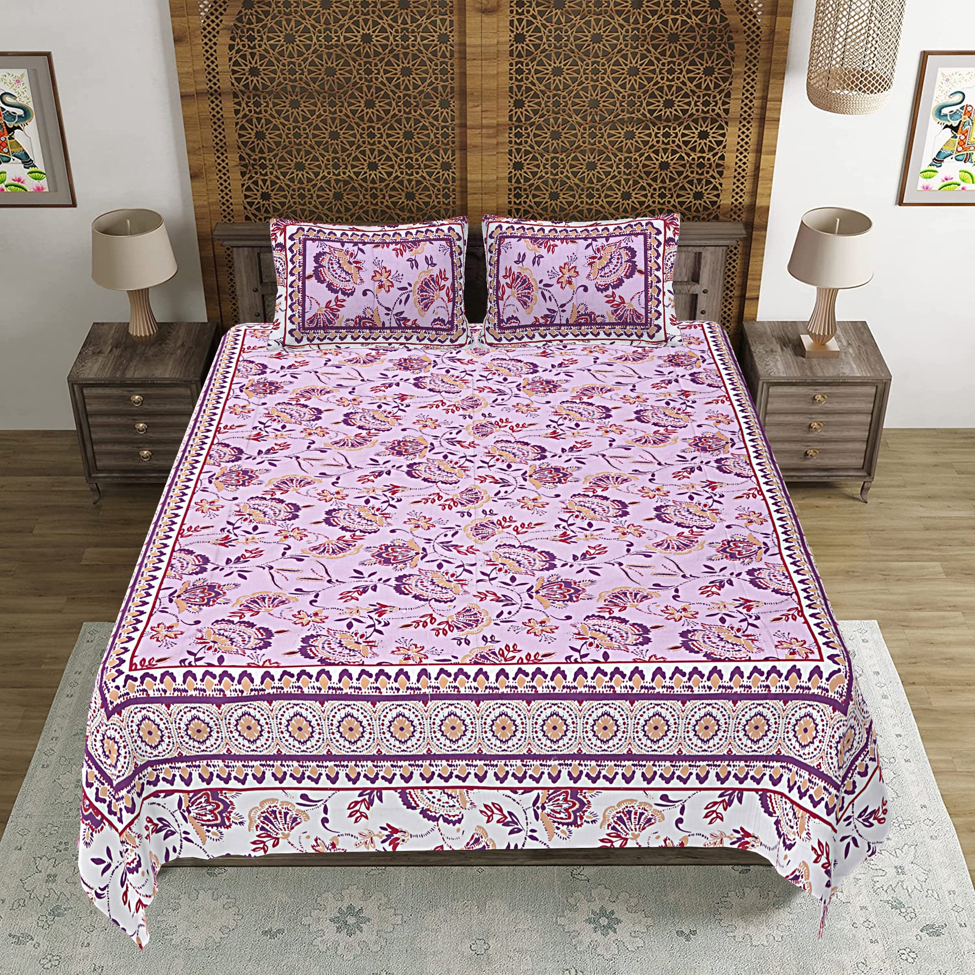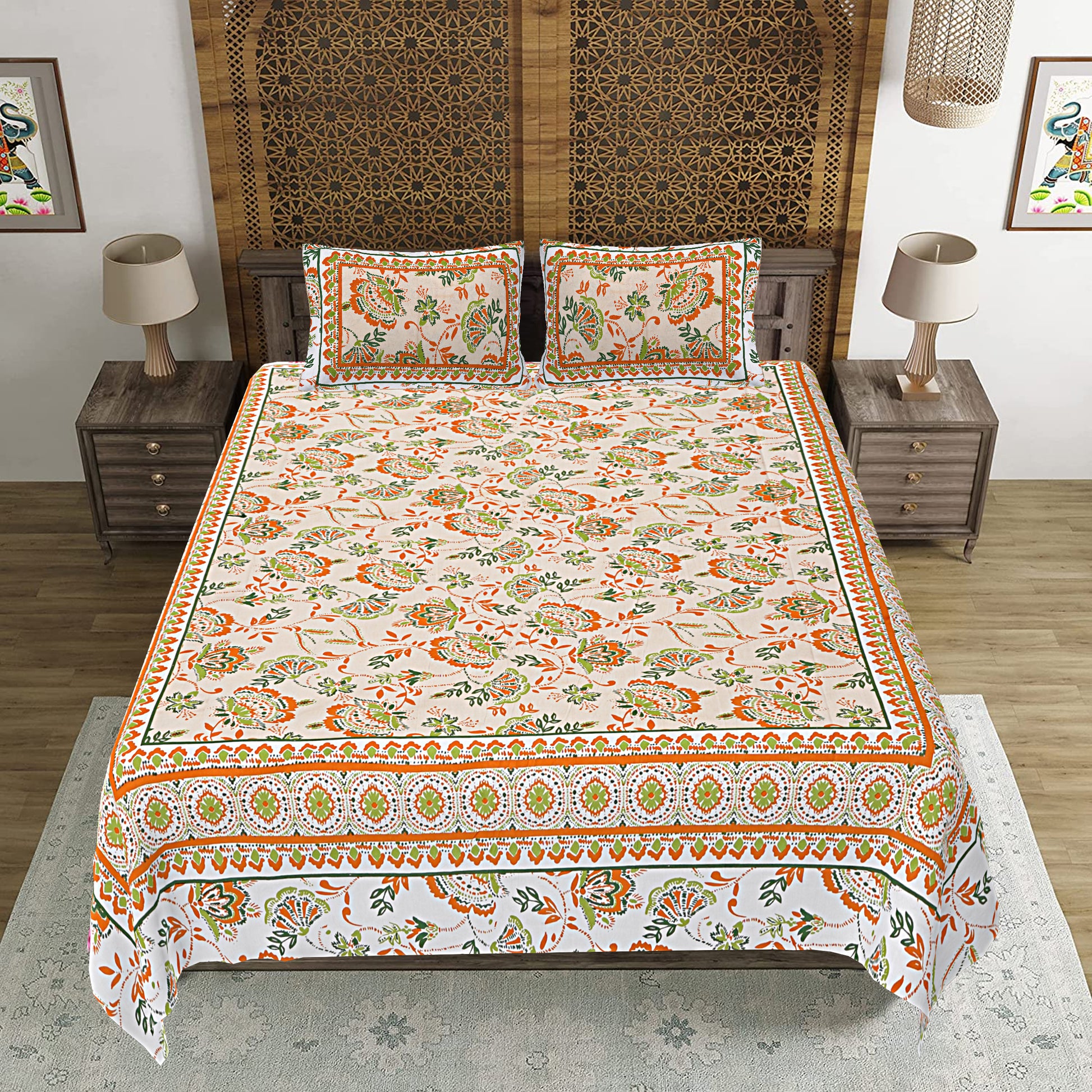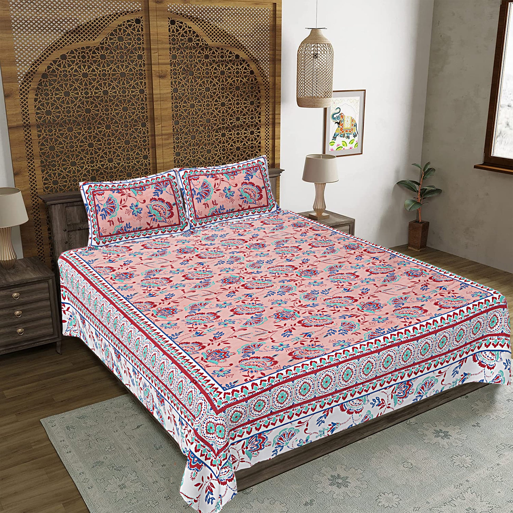 Jaipuri Bedsheet 100% Cotton Rajasthani Traditional Super King Size Bedsheet with 2 Pillow Cover 100*108