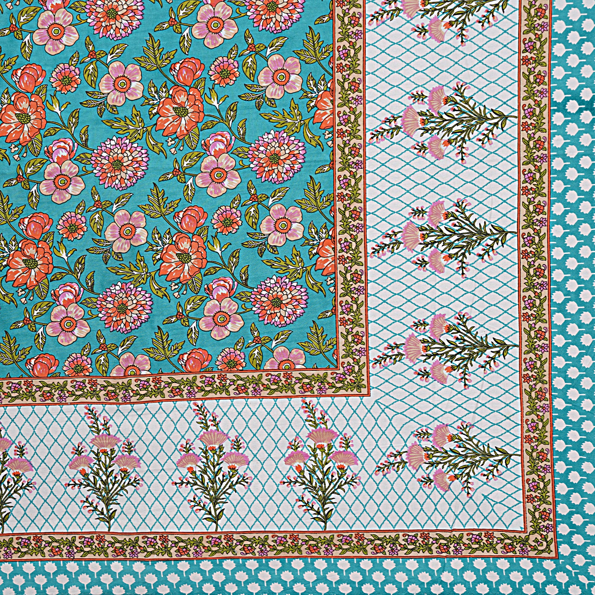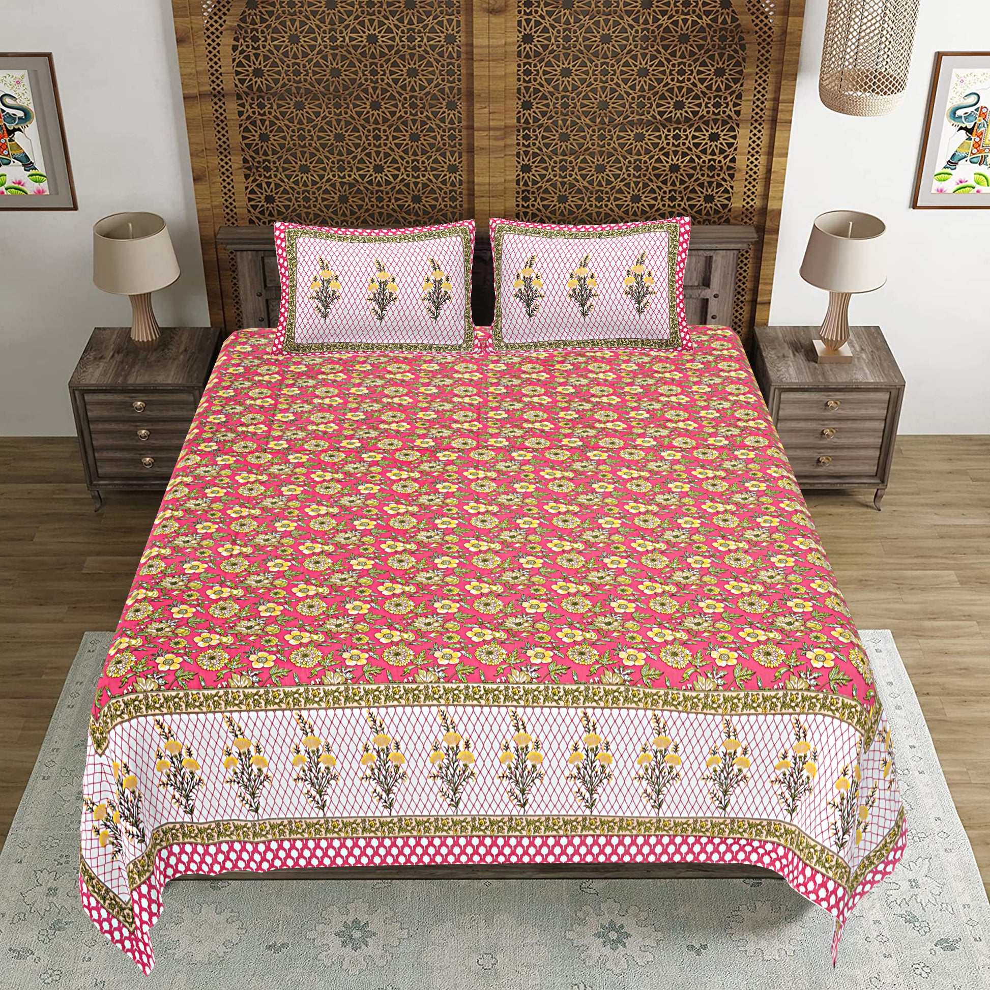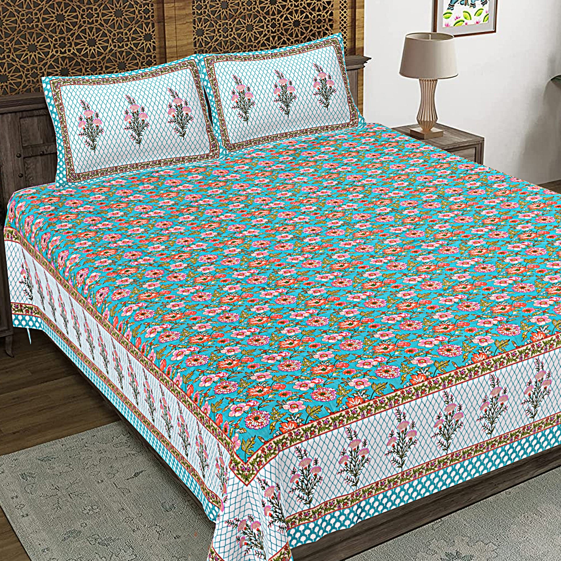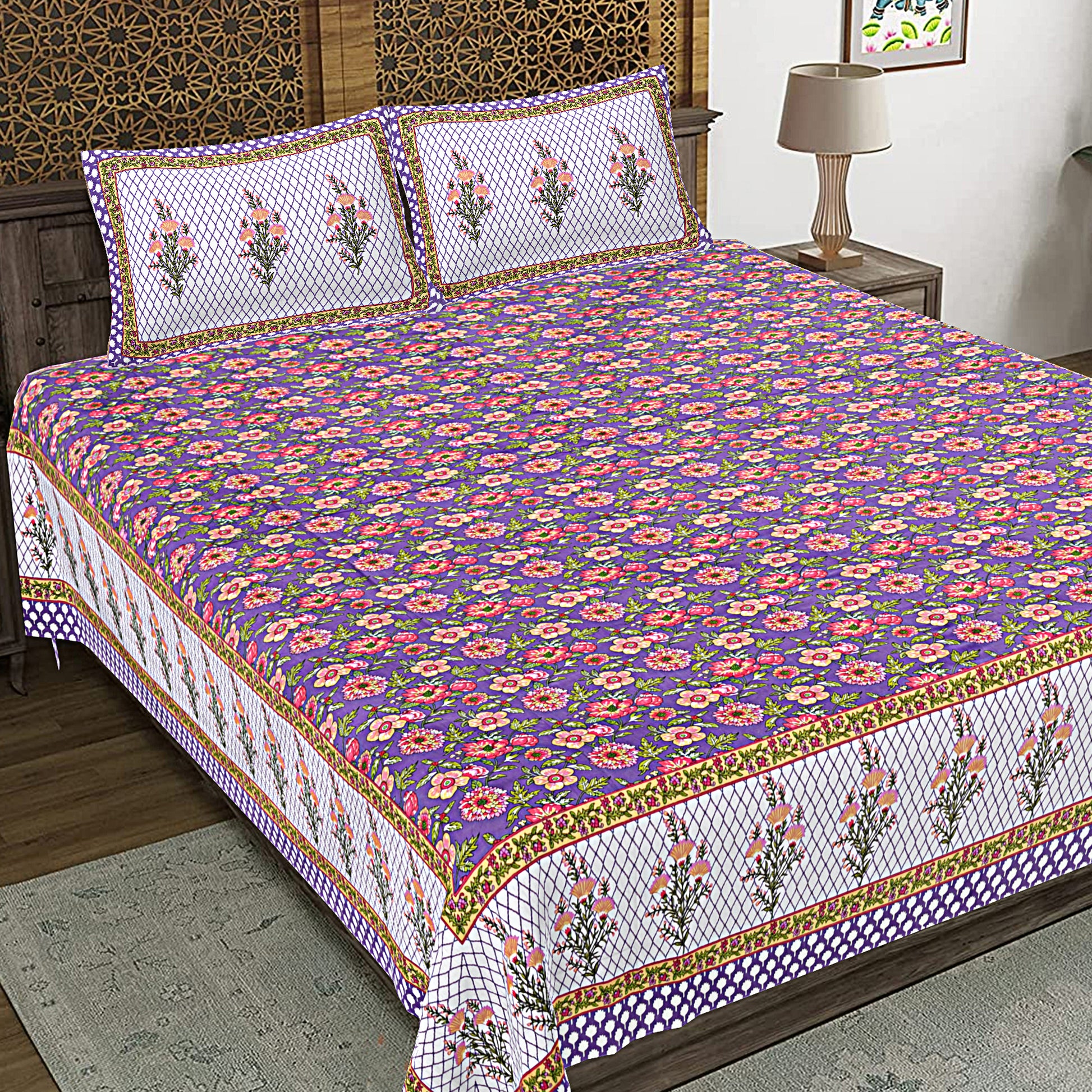 Jaipuri Bedsheet 100% Cotton Rajasthani Traditional Super King Size Bedsheet with 2 Pillow Cover 100*108